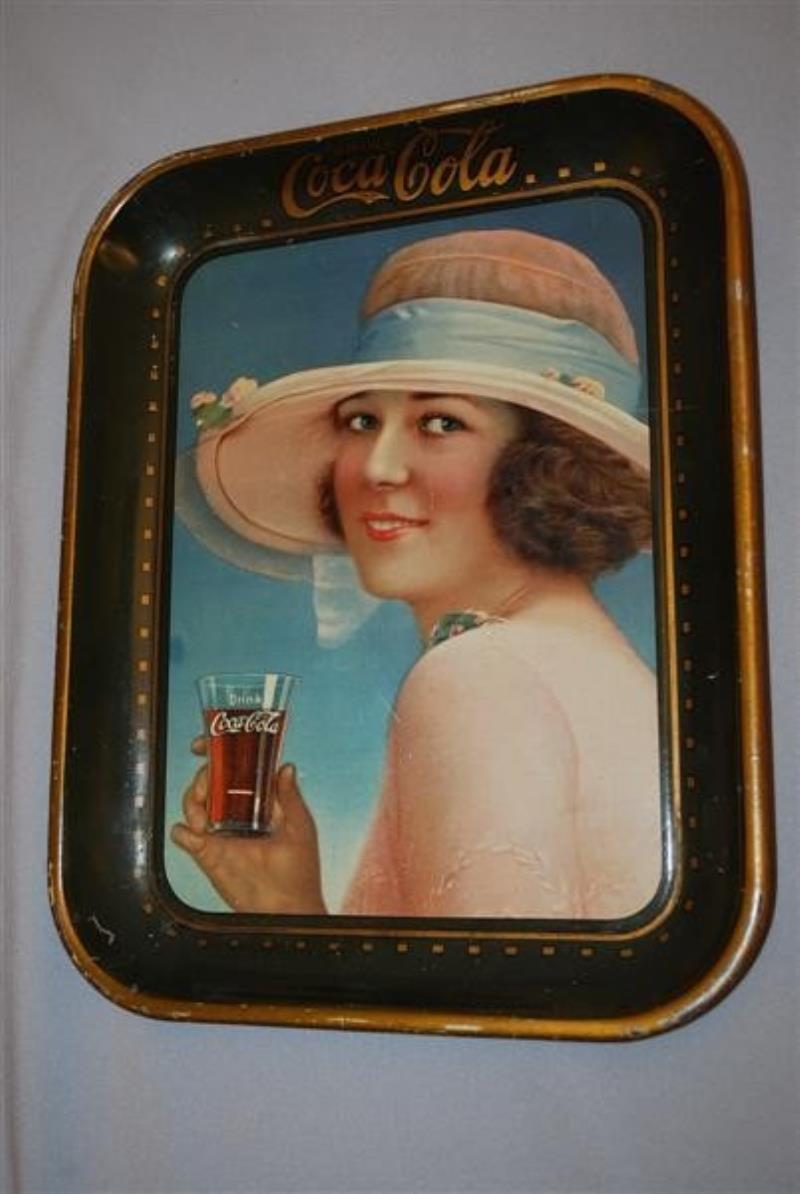 Coca-Cola serving tray, 1921, Lady w/Blue Hat, litho on tin by The H.D. Beach Co.-Coshocton, O., a very hard-to-find tray, VG cond, 13"H x 10.5"W.