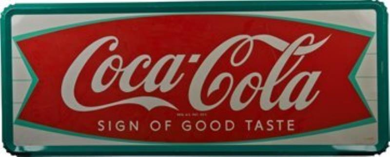 Coca Cola Self-Framed Single-Sided Metal Advertising Sign w/Decorative Bottle Cap Grooves On Corners, “Sign of Good Taste” 24” x 59”.