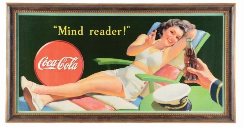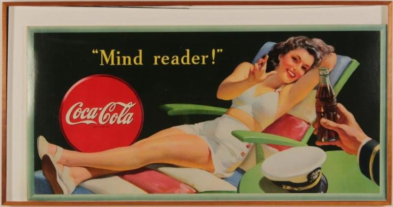 DESCRIPTION: 1944 Coca-Cola lithograph poster entitled "Mind reader!". Marked lower left "Copyright, 1944 - by The Coca-Cola Company". Marked lower right "Litho. in U.S.A. by Edwards & Deutsch Litho. Co., Chicago". Black frame. MEASUREMENTS: 56" x 27". Overall with frame…