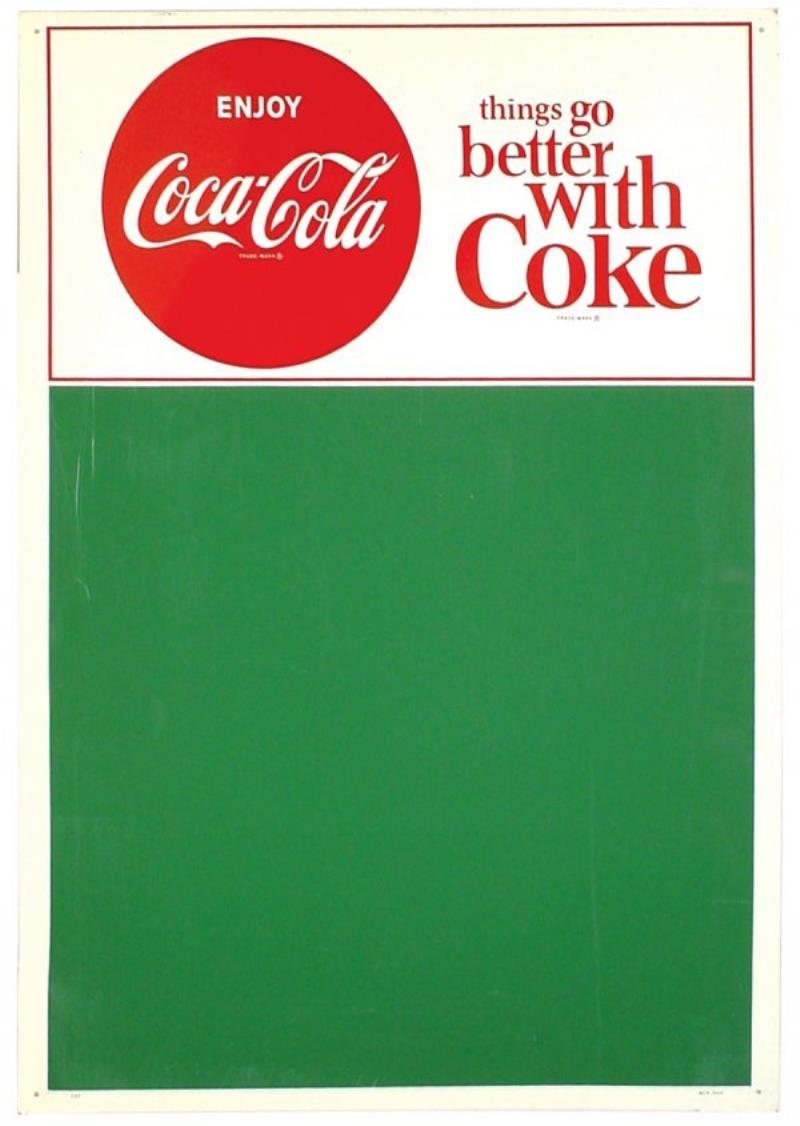 Coca-Cola menu board, "Things Go Better with Coke", c.1964, new old stock in Exc cond, 28"H x 19.75"W.