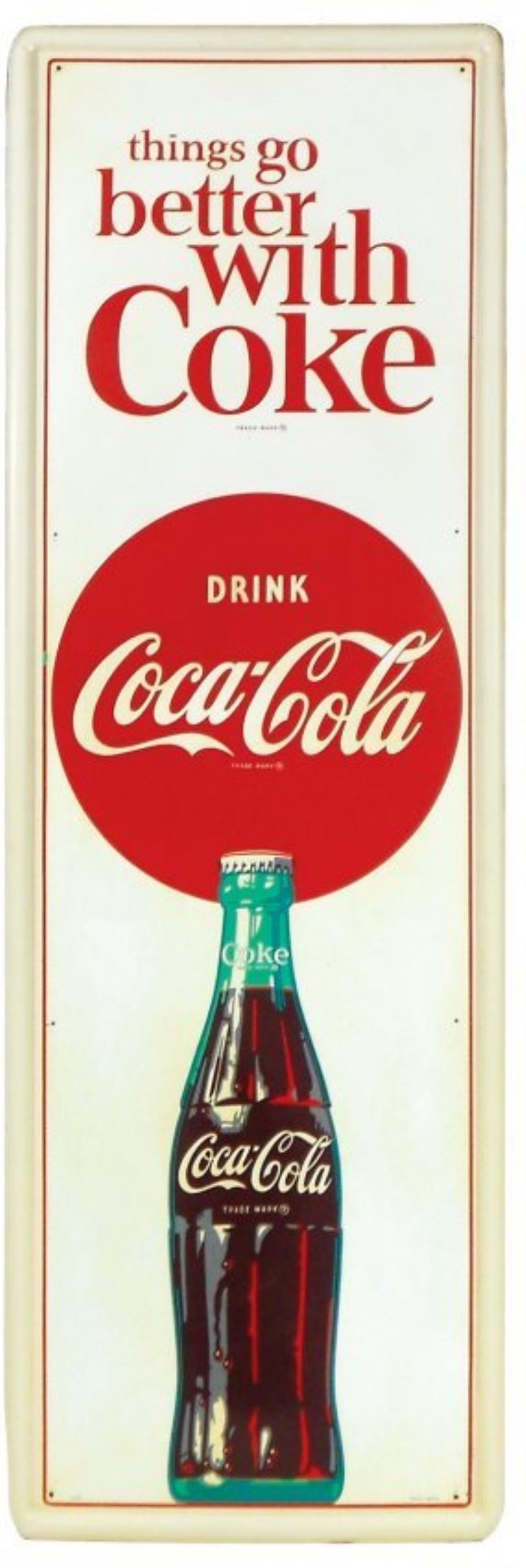 Coca-Cola Sign, "things go better with Coke-Drink Coca-Cola", litho on metal, c.1964, some litho paint smear at bottom of bottle & 2 spots of rust on bottom edge, rest in Exc+ cond w/strong color & gloss, 54"H x 18"W.