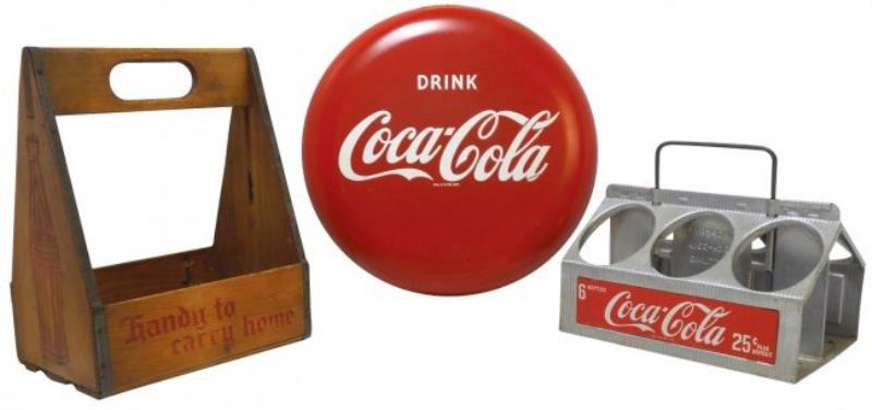 Coca-Cola button sign, metal, 12"Dia & wood & metal 6-pack carriers, all VG/Exc cond, 9.5" & 10"H.