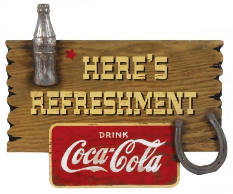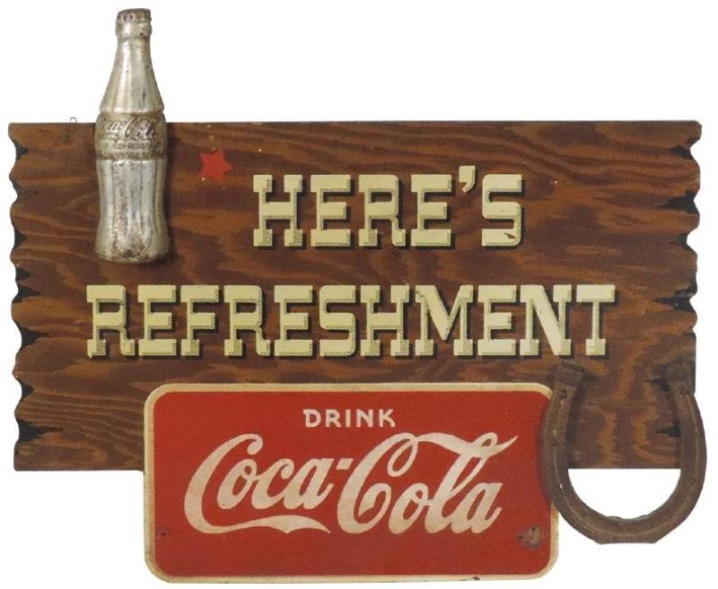 Coca-Cola sign, wood bottle & metal horseshoe, "Here's Refreshment," VG cond, 14.5"H x 17"W.