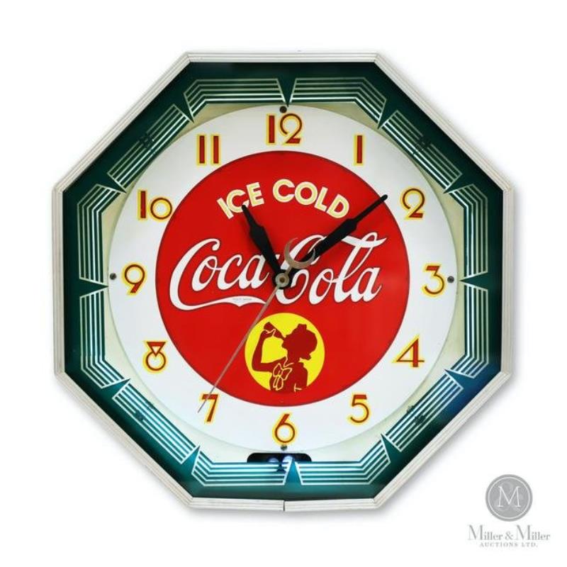 Ice Cold Coca-Cola w/Silhouette Girl neon motion clock, Very Rare, mfgd by Neon Products Inc., Exc working cond, 18"Dia.