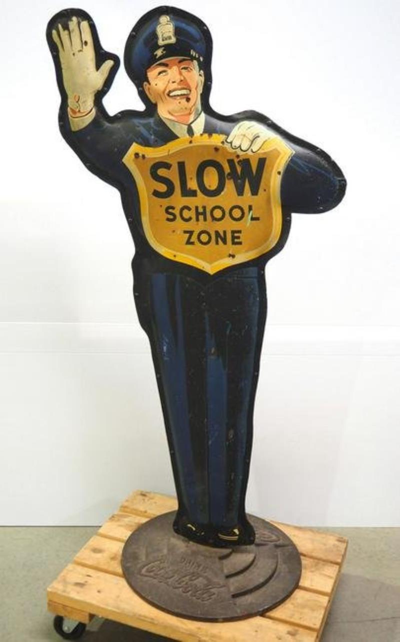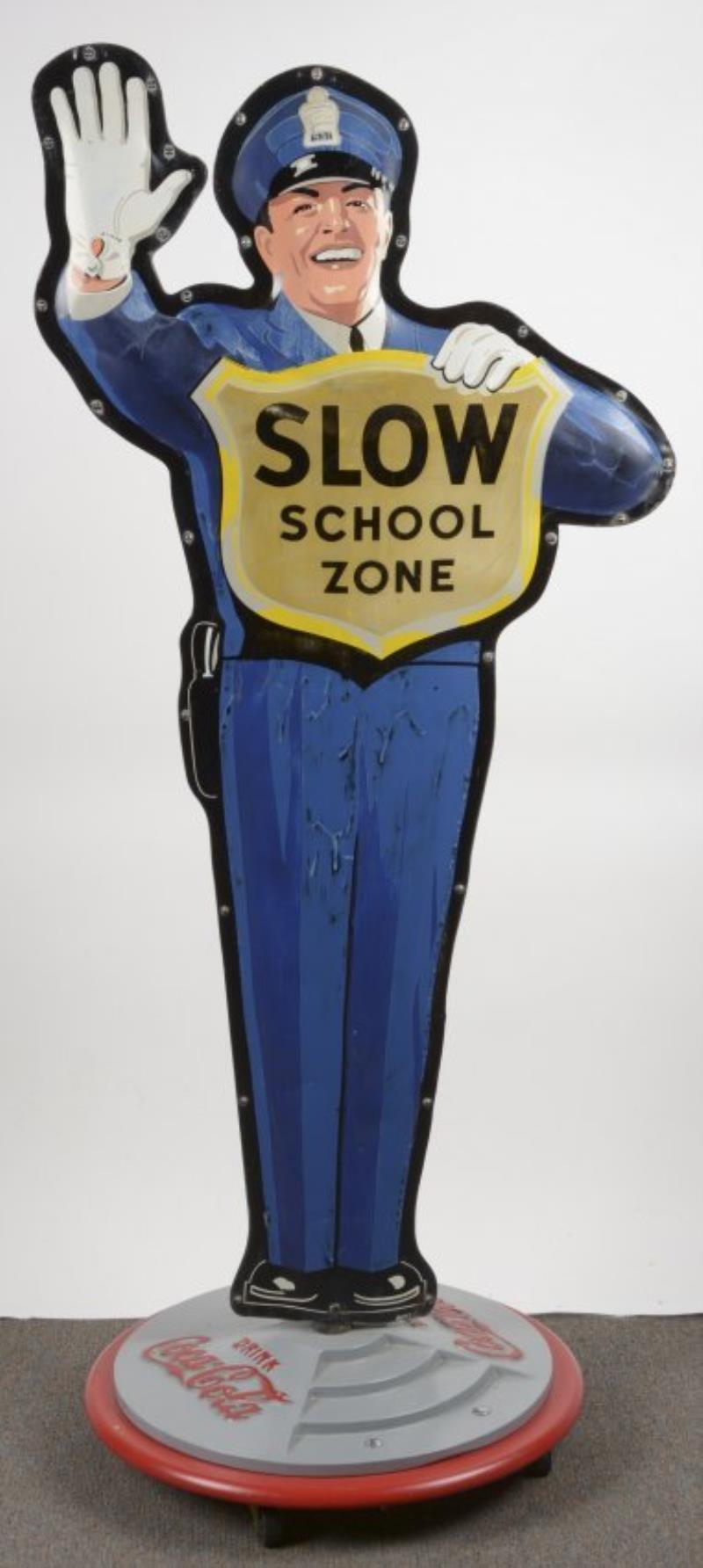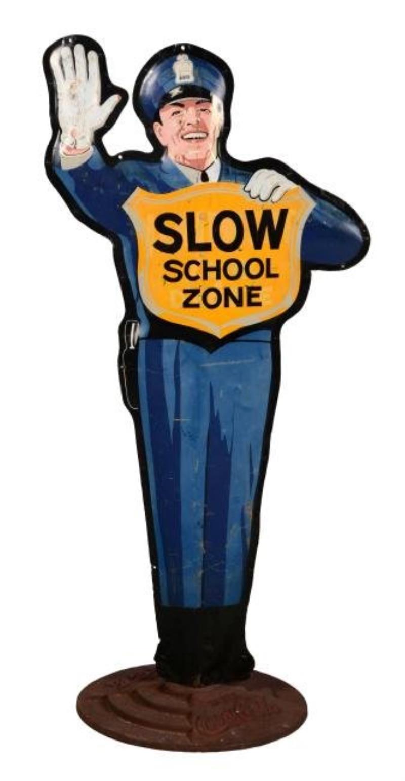 Coca-Cola Slow School Zone Policeman, diecut steel double-sided figure w/Drink Coca-Cola on verso, orig embossed cast iron base, Good cond w/age scuffs & abrasions & some surface oxidation, 64"H x 30"W.