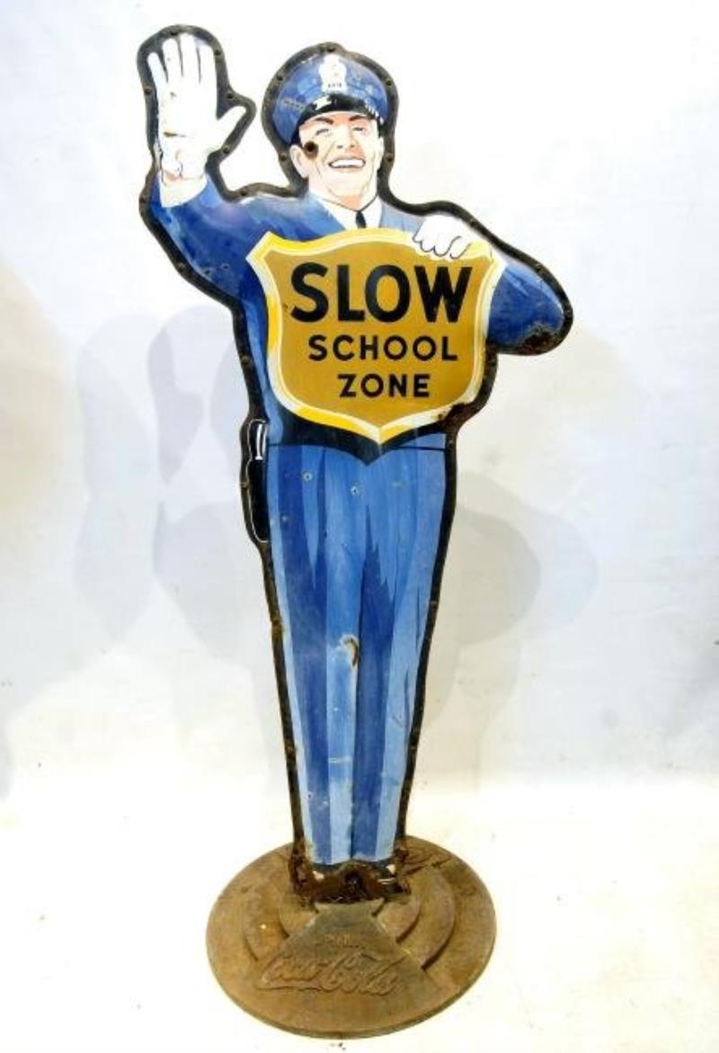 30"x60" DST Coca Cola Slow School Zone policeman on cast iron Coca Cola base -Fair, policeman has some spots rusted through, WILL NOT SHIP - LOCAL PICKUP ONLY