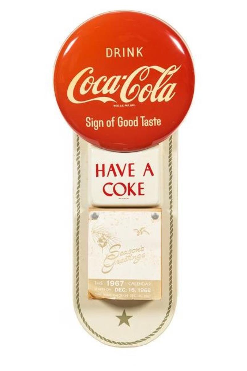 SST. It has good color and gloss. It shows light wear, slight discoloration, minor paint loss, and small flaws throughout. The paper of the calendar shows some minor damage. It displays well. Measures: 19.25"x8" Rating: 8.5 Est: $250-$500