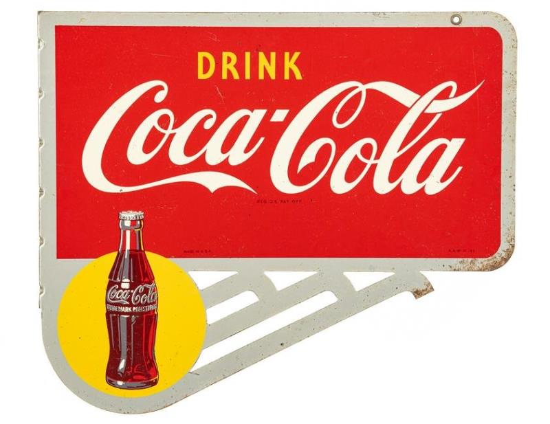 SSTE. It has good-average color. It shows wear, paint loss, discoloration, metal damage, and bends/dents. It displays well with the bottle. Measures: 47.5"x23.75" Rating: 7.75 Est: $300-$600