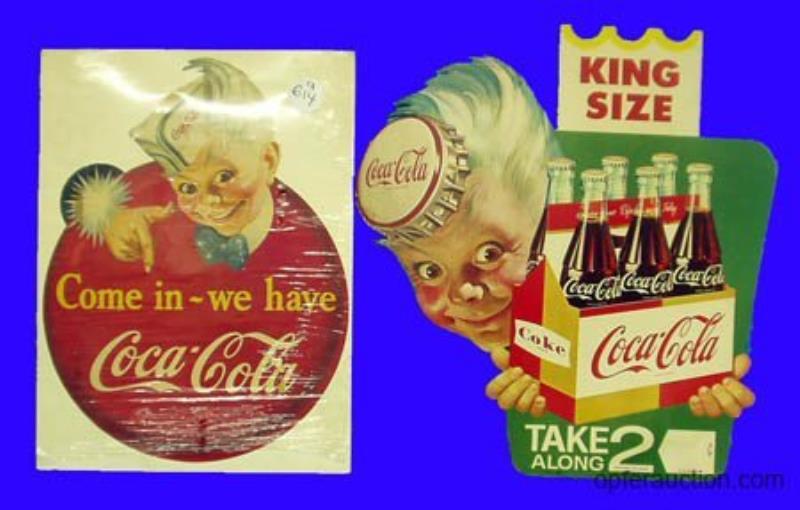 Included in this lot is a 1940's easel back sign. It does have some moderate cardboard loss, soiling and tears. Also included is one wooden Kay Displays "Pause, Refresh" Coca-Cola sign with minor soiling and paint loss, a paper 10ยข…