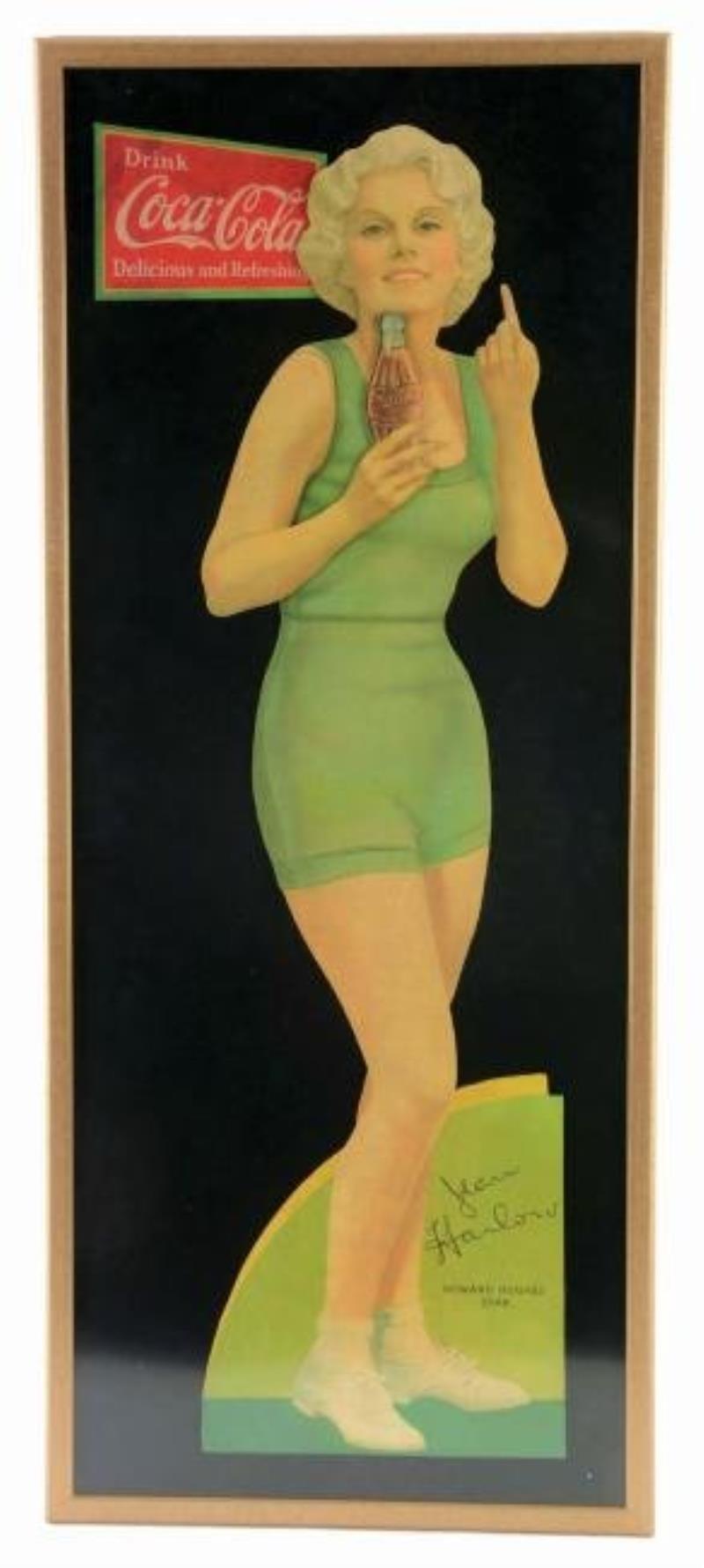 Coca-Cola diecut cdbd standup, Jean Harlow - Howard Hughes Star, Rare, litho by Snyder & Black, Prof mounted & framed, c.1932, repaired neck bend & some o/all fade, Good+ to VG cond, 45.75"H x 19.75"W.