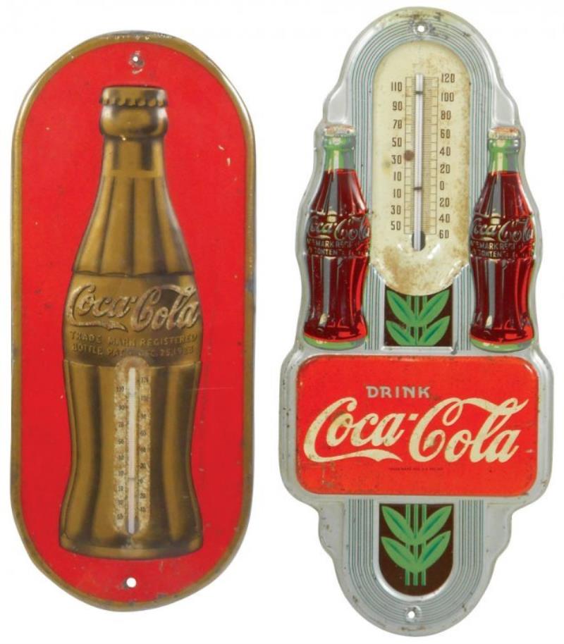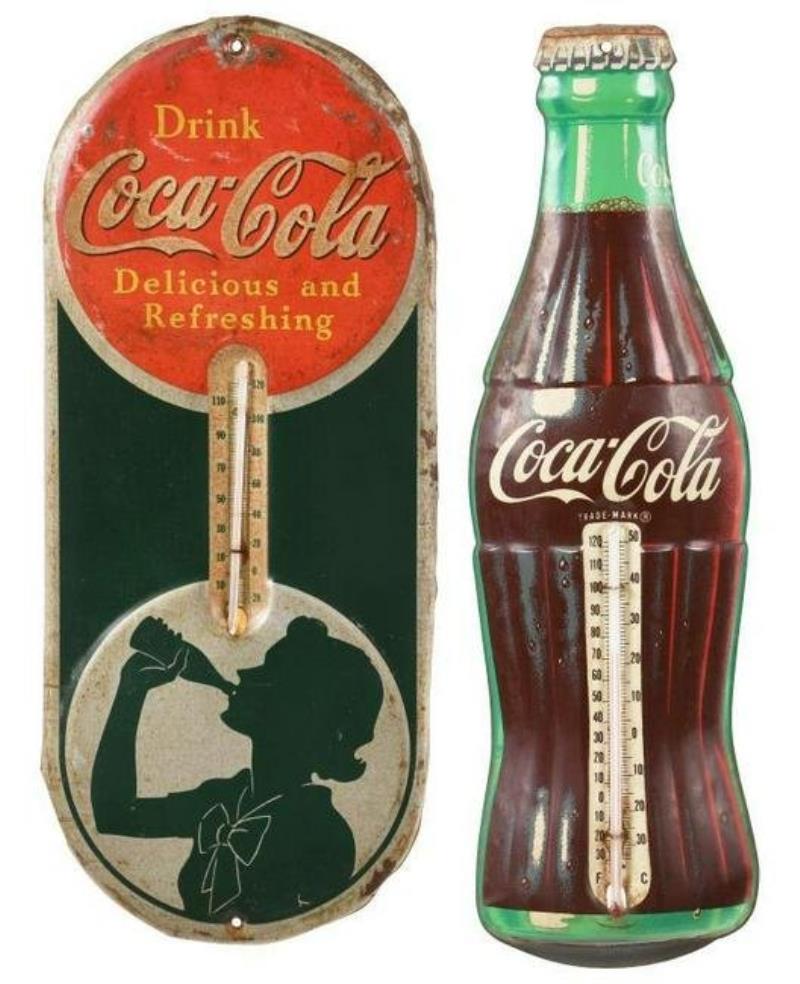 Coca-Cola Thermometers (2), "Silhouette Girl" litho on embossed metal by Robertson, c.1939 & Coca Leaf & Bottles by Robertson, c.1941, both VG cond w/normal wear, the 1st w/glass tube absent, 2nd not functional, larger 16"H x 7"W.