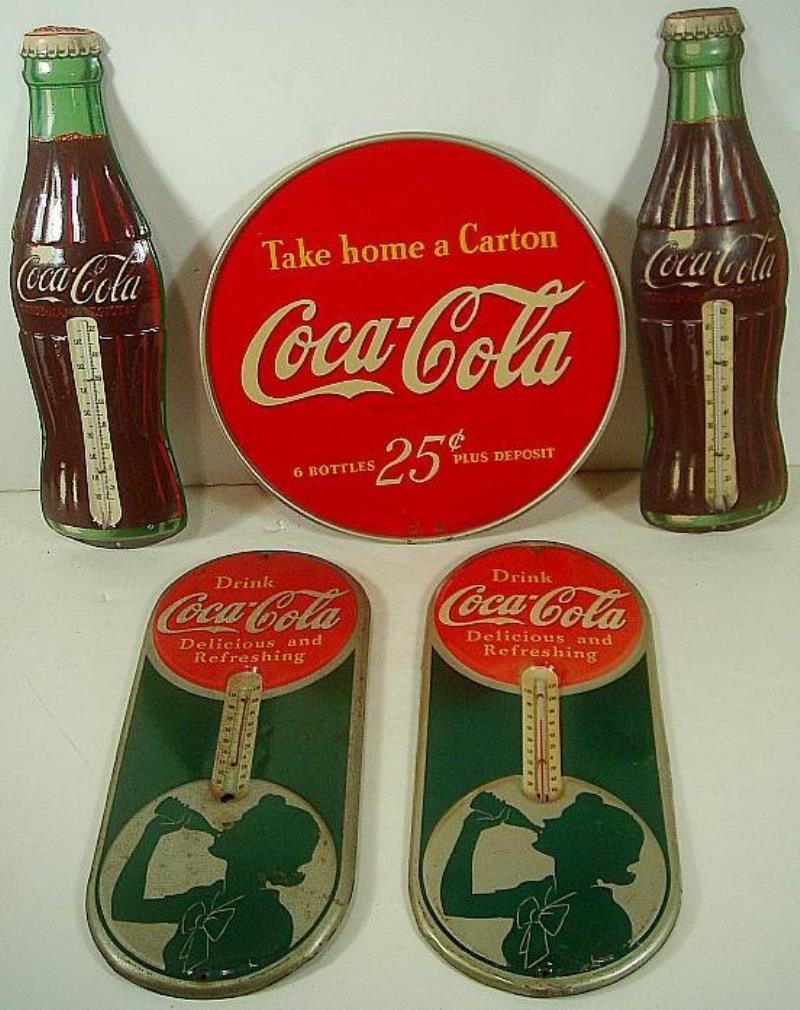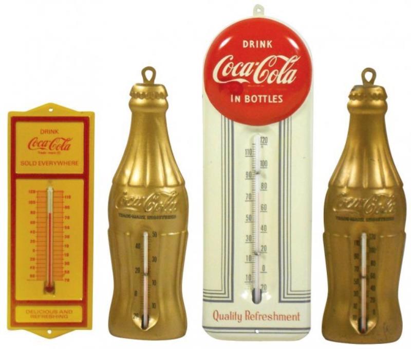 Coca-Cola metal thermometers (4), embossed yellow & red "Drink Coca-Cola Sold Everywhere", embossed "Drink Coca-Cola in Bottles" & 2 gold bottles, c.1950's, Exc cond w/minor inpainting on button sign, up to 9"H x 3"W.