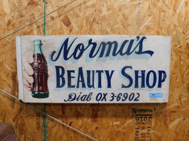 Tin Coca-Cola sled sign Norma's Beauty Shop Dual OX-3-6902. 2 inches by 16 inches by 2 1/2 inches, tin porcelain sign, one end has some damage to porcelain minor surface rust, minor scratches, displays nice, see pictures