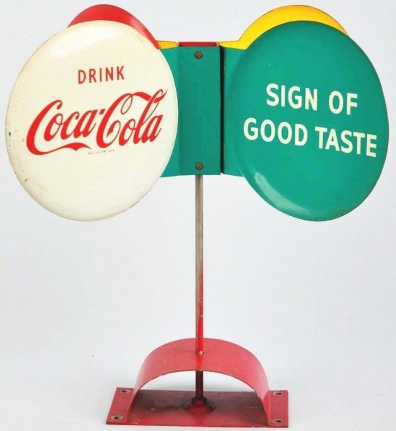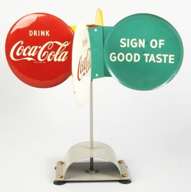 This rare 1950's spinner sign was meant to go on top of vending machines. Still retains its original suction cups on the bottom of the base. The signs on the top show some mild scrapes but do display well above average. This piece does not appear to have been used but does have some storage wear. (Excellent). 14'' T.