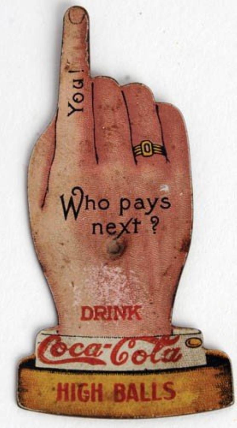 c.1900 Spinner, tin litho 2 ¾" hard to find. This example is a strange variation, normally the bottom has "Refreshing" this one has "Highballs". Customers would spin to see who pays for the Cokes. Color is all good on this…