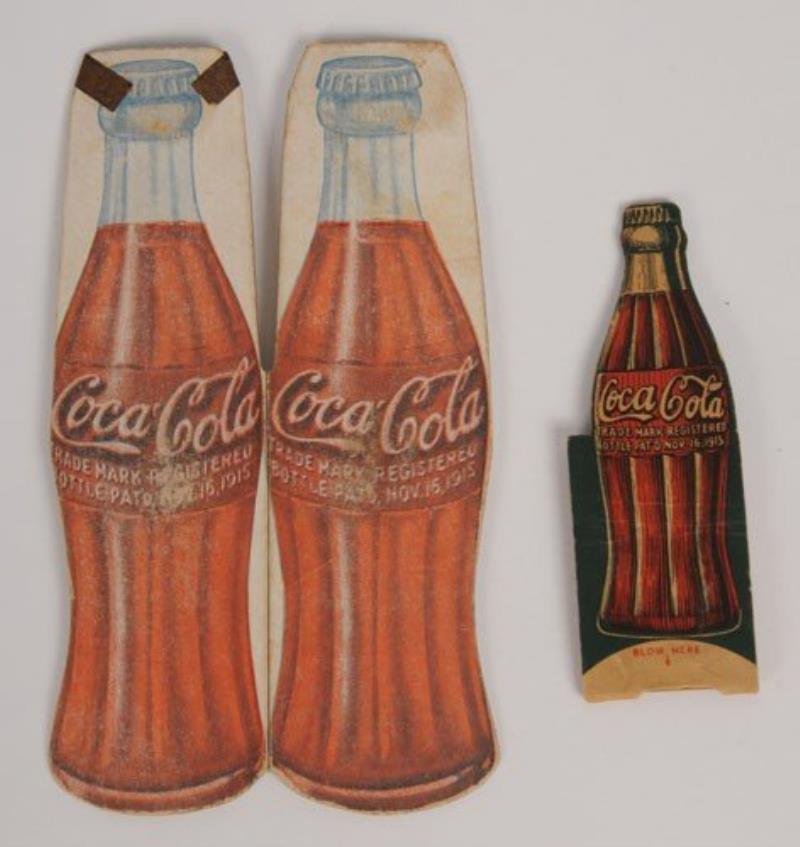 5 3/4" tall and 3 3/4" tall; the larger is circa 1916 to 1920; smaller from 1920's both feature a 1915 bottle; some surface rubs; medium soiling and staining; minor mildew spots on the larger whistle; minor bends and light…