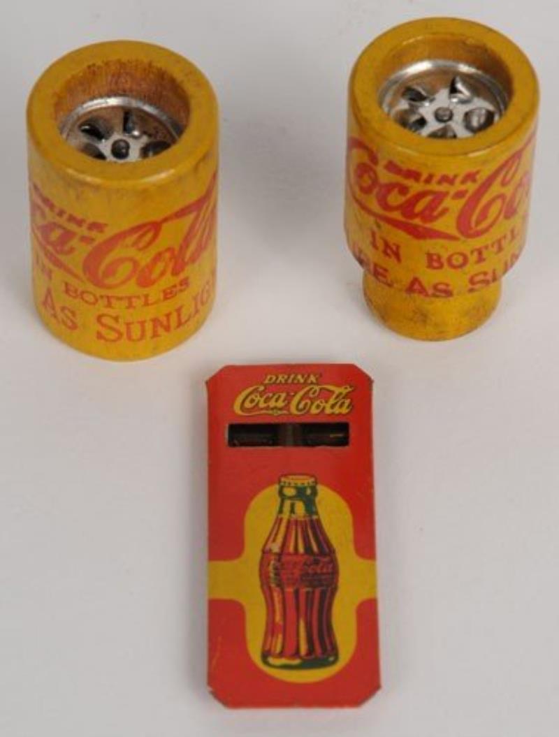 Coca-Cola smalls (4), red pr & blue pr cufflinks, celluloid, c.1920s; red tin whistle w/bottle on front, c.1930 & metal bottle cap whistle w/minor paint loss, o/wise all Exc cond.