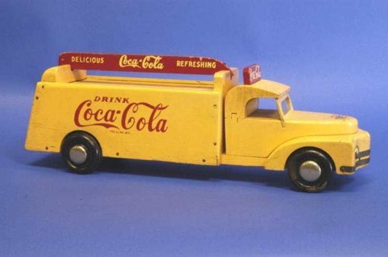 1947-48 Post-war all wood construction, painted in yellow body, large red back door that opens, red sign board the length of body roof. Missing six yellow blocks simulating Coca-Cola cases; one of the rarest wood toys to find. 20'' long.