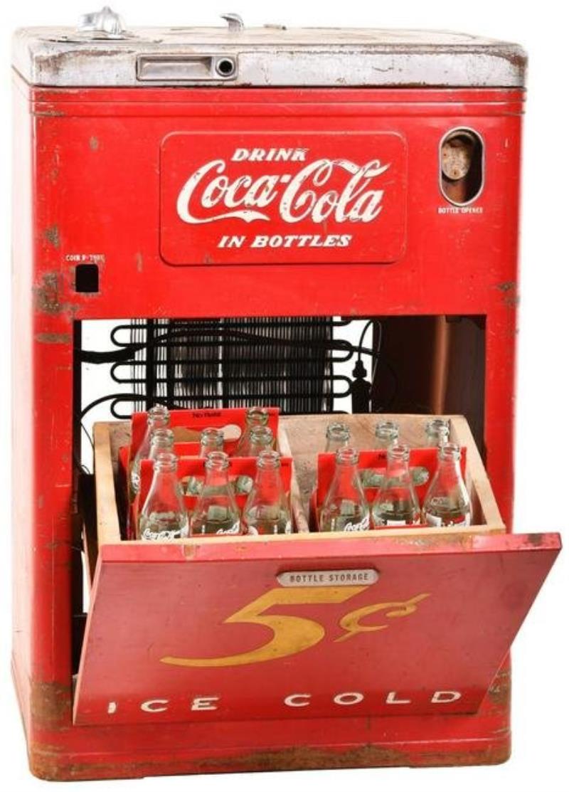 Coca-Cola Coin-Operated Vending Machine, Vendo 81A, 10 Cent, VG to Exc orig working cond, interior door panel w/fractures, c.1955, 58"H x 28"W x 20"D.