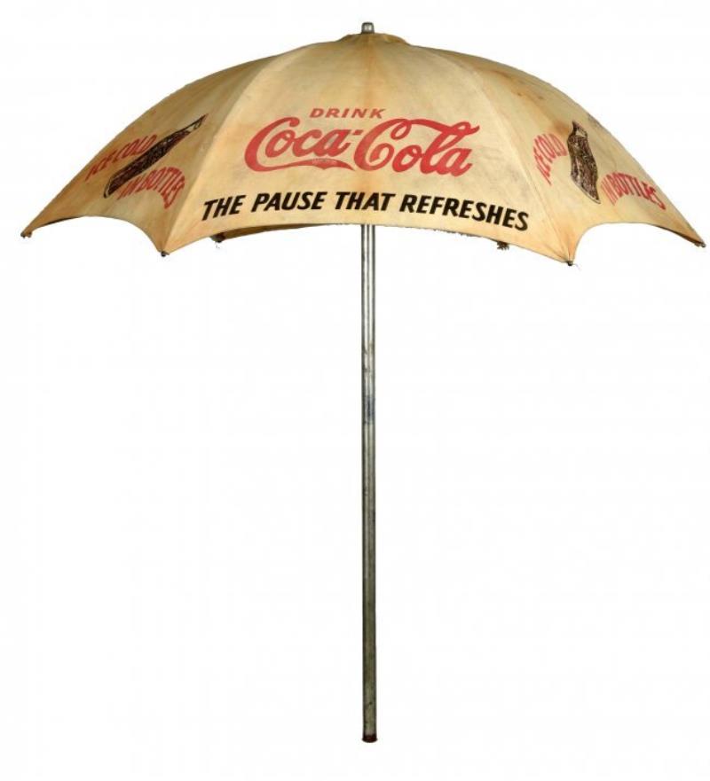 This is a very nice umbrella, imprinted on each panel, including a 1915 Coca-Cola bottle and script logo that reads "Drink Coca-Cola in Bottles". There is moderate soiling with some tears and missing 3" x 1" piece of fabric on…