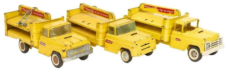 Collection of three "Buddy L" New York tin toy delivery trucks, featuring Coca-Cola advertising embellishments, with small accents 7"h x 6"w x 14.5"d/ largest