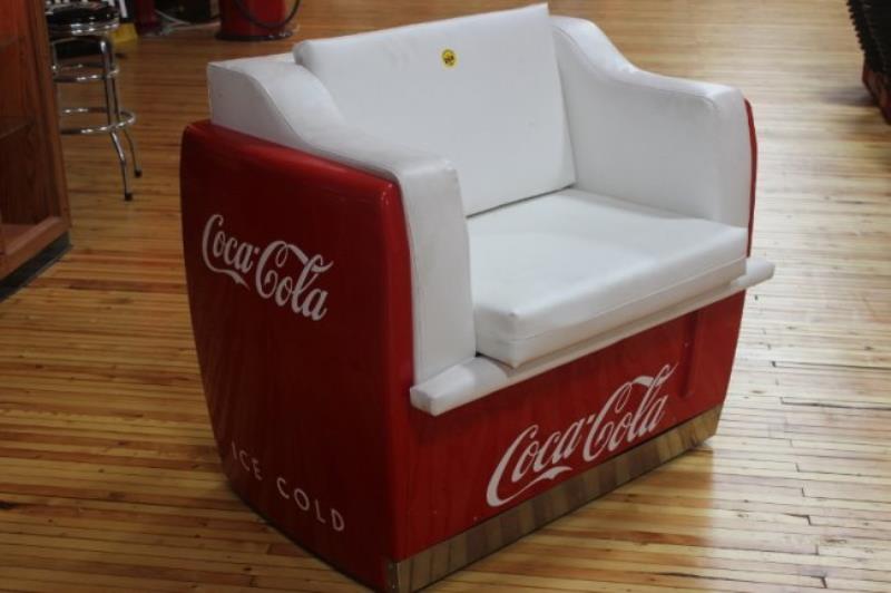 Custom Coca-Cola Cooler Bench. The body of the seat is in the form of a Coca Cola Cooler with raised "Drink Coca-Cola, Ice Cold" lettering on all 4 sides; has heavy vinyl white and black striped upholstery with removable cushion and cup holders in the back corners. In excellent overall condition, label under the seat reads "Classics, by Cocaholics" of Sarasota, Fl. Measures 33.5 in. high x 43.5 in. wide x 26.5 in. deep.