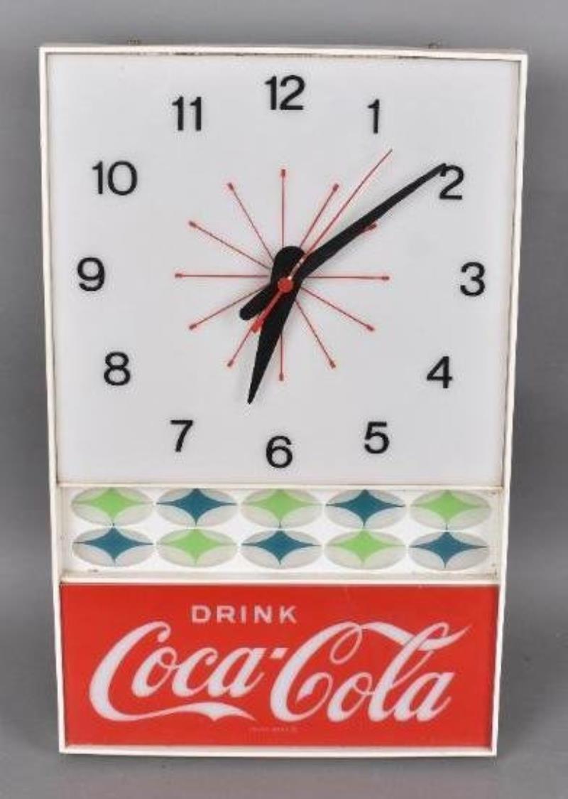 Reverse on glass light up Coke clock in metal housing, Made by Modern Clock Advertising Co of Brooklyn 8, NY. Circa 1950's, lights up and clock works. Condition (Excellent)/ Size 23" x 23" x 5"