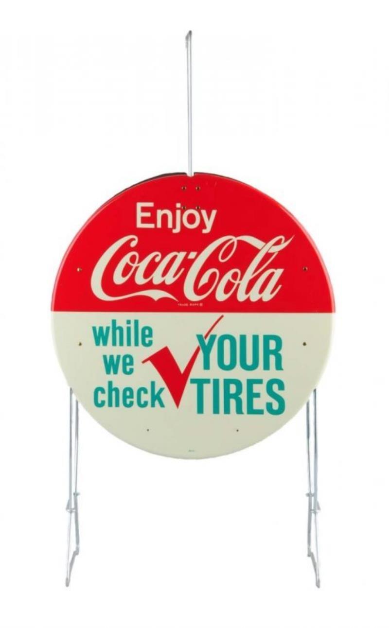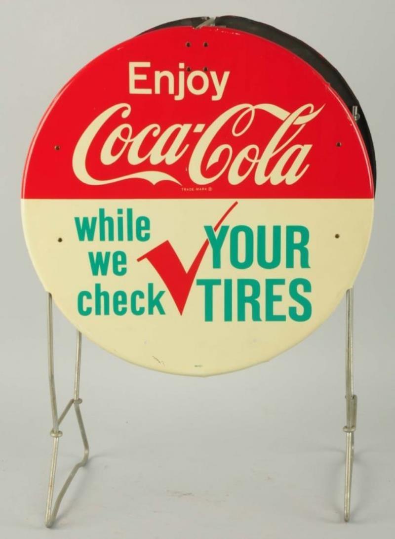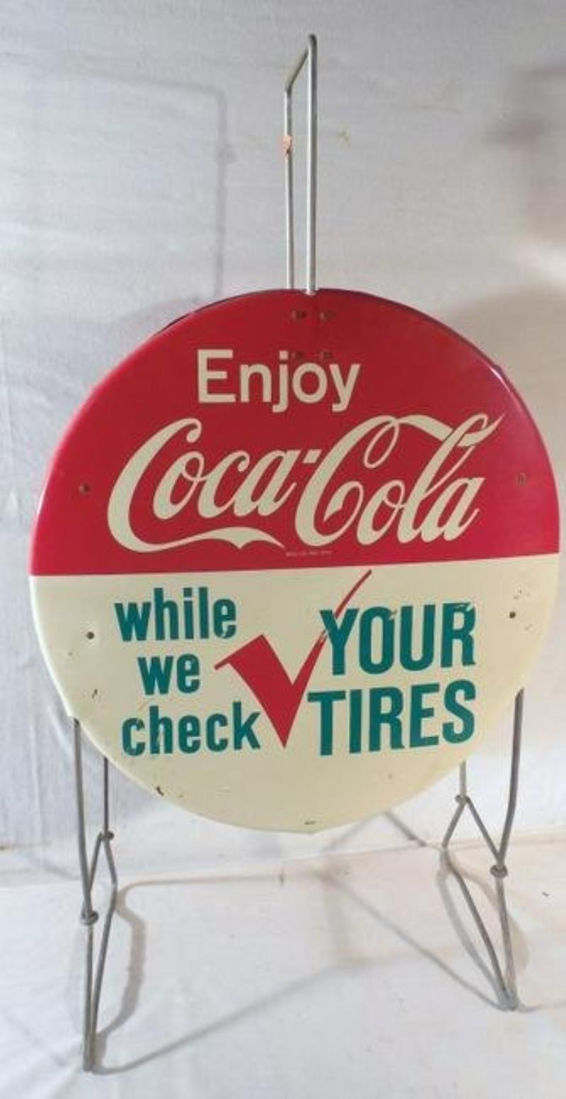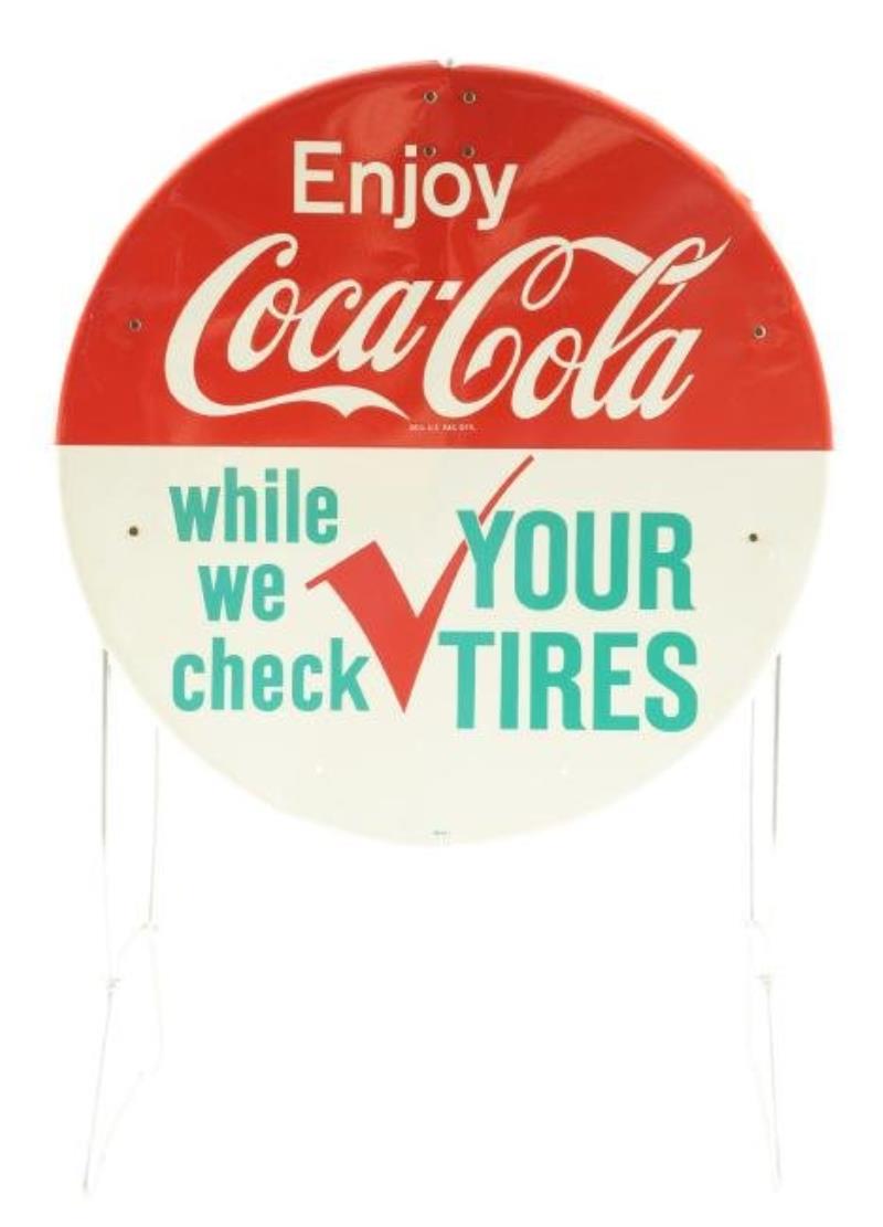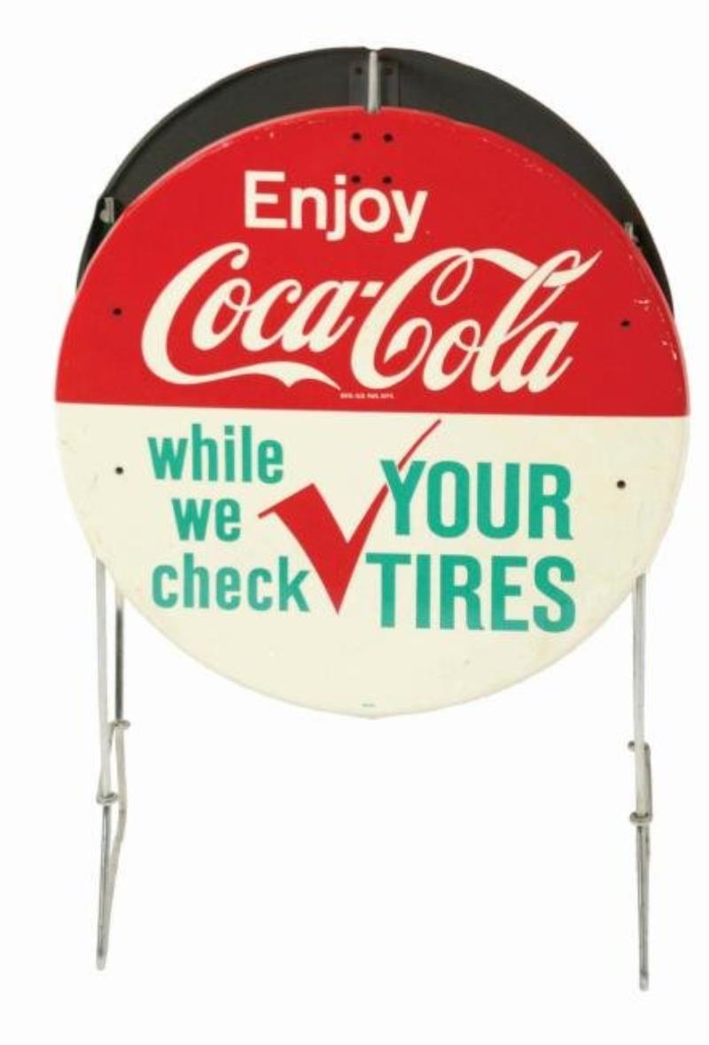 Coca-Cola tire display rack, "Enjoy Coca-Cola While We Check Your Tires", 2-sided metal, c.1950's, Rare, Exc cond on both sides, 32"H x 17"Dia.