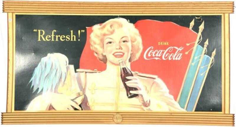 VINTAGE 32 1/2" X 61 1/2" COCA-COLA ADVERTISING PRINTSCENE OF DRUM MAJOR - "REFRESH" - GOOD FRAME - PRINT HAS HOLE IN UPPER RIGHT CORNER