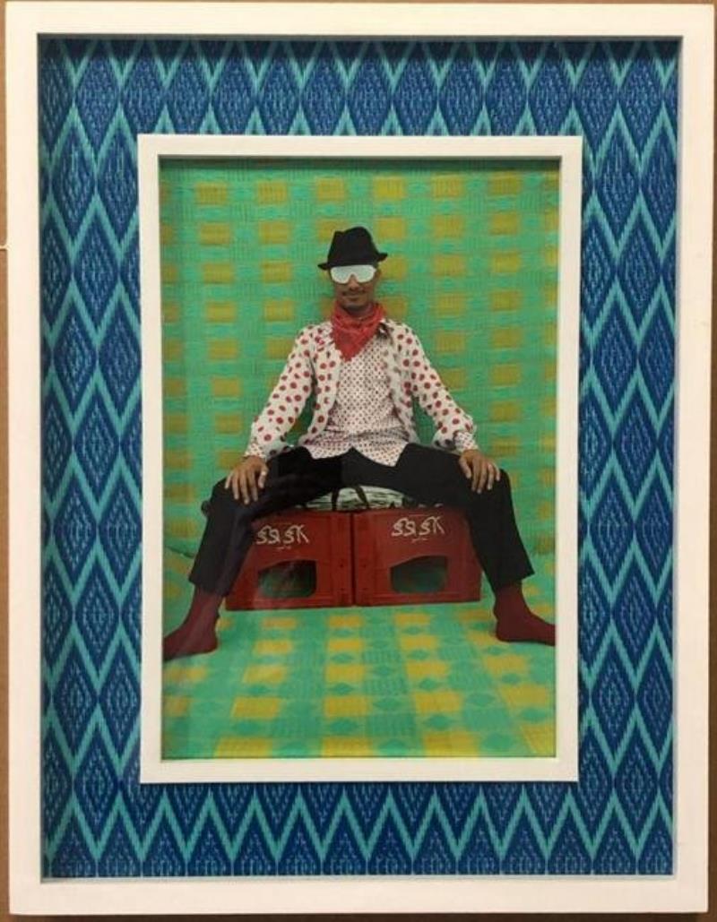 Hassan Hajjaj (Born 1961, Morocco). Titled "Mr. J. James". Metallic Lambda Print in wooden frame with woven plastic matting. Great image showing Mr. James" sitting on Morrocan Coca Cola crates. Image size seen approx. 10" x 15", overall framesize approx.…