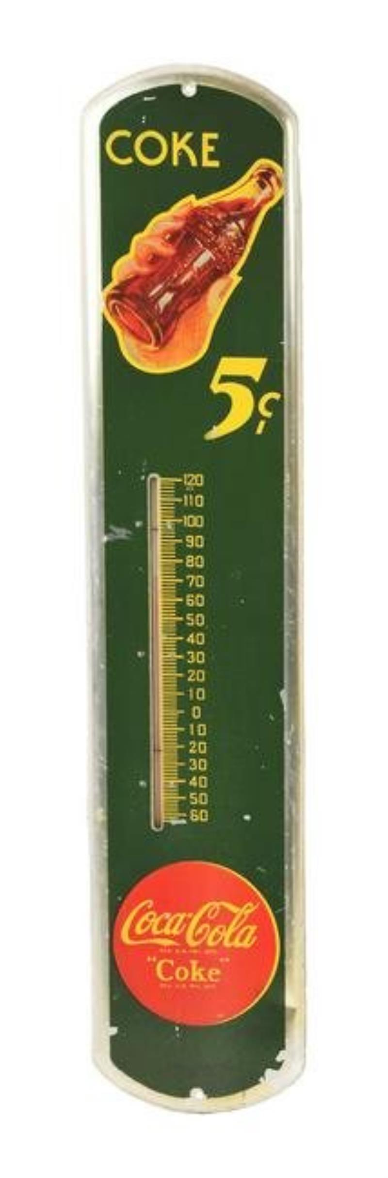 SST. Coca Cola 5 cent Thermometer. This piece shows signs of paint loss throughout the field and at the lower right-hand corner. Good color and original gloss throughout. Also has the original thermometer bulb and cradle in working condition. An…