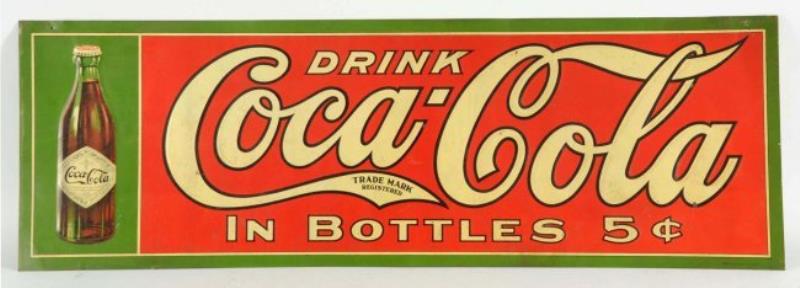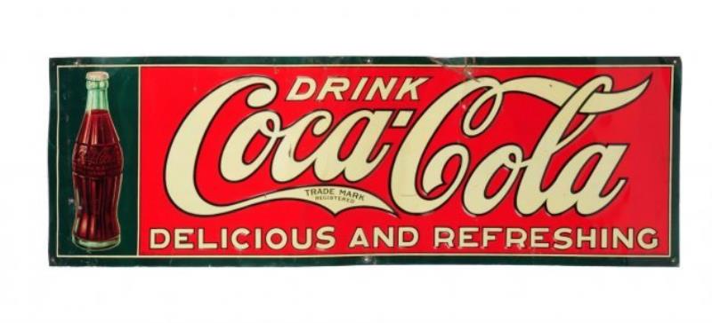 Circa 1910. This sign depicts an early Coca-Cola bottle at the left. It has overall scratching and crazing, especially visible in the white letters. A few shallow bends here and there. Condition (Very Good). Size 35 - 1/2" L.