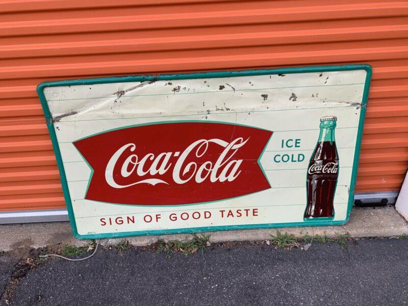 VINTAGE Tin enjoy Coca Cola Sign Fishtail panel 1950s 55.5x32