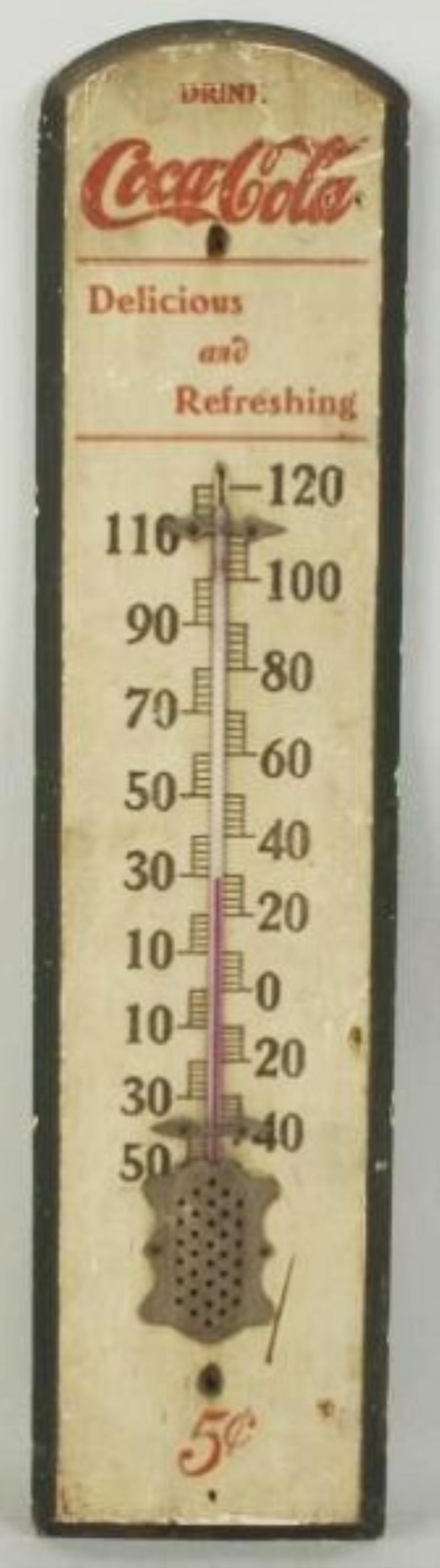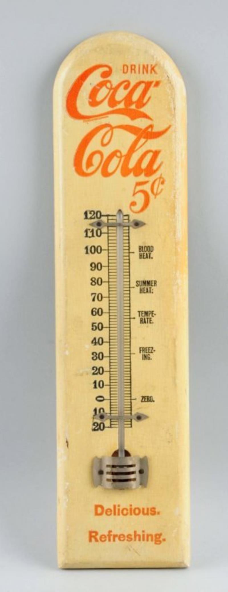 The thermometer with the Coca-Cola bottle is made of masonite and has a working thermometer. There is moderate soiling, scrapes and edge wear. The taller wooden thermometer is missing the tube and does have some wood loss to the top…