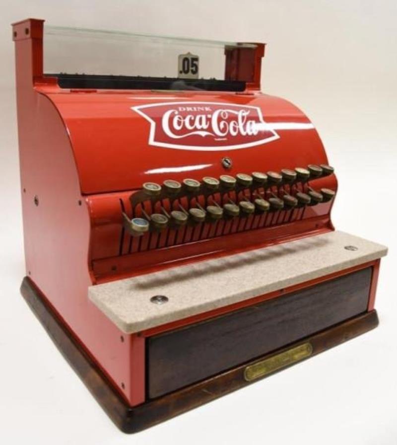 Very nice custom restored National Cash Register model No. 736. Very nice condition with wear from display. Displays very well with custom Coca-Cola motif. Measures approximately 17" across by 17" tall by 16deep.