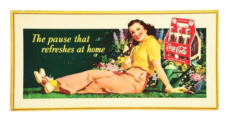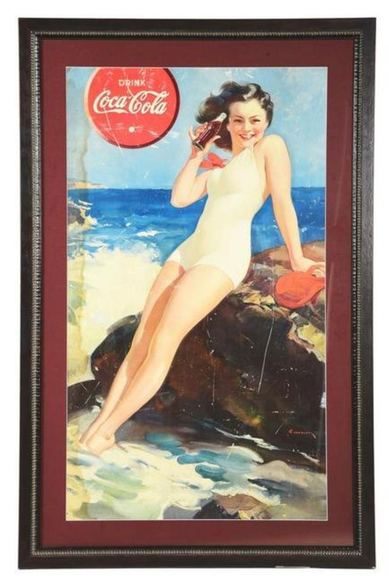 Excellent piece of 1940's Coca-Cola advertising with an outstanding graphic of a lady sunbathing on the beach. This piece has areas of water damage throughout and a bend from top to bottom on the left and right-hand sides of the piece. It otherwise retains excellent color and displays nicely with the new added frame. This is not a standard shippable item and will require 3rd party shipping or pickup arrangements to be made. Condition: (5.2). Dimensions: 28 - 1/2" x 57 - 1/2".