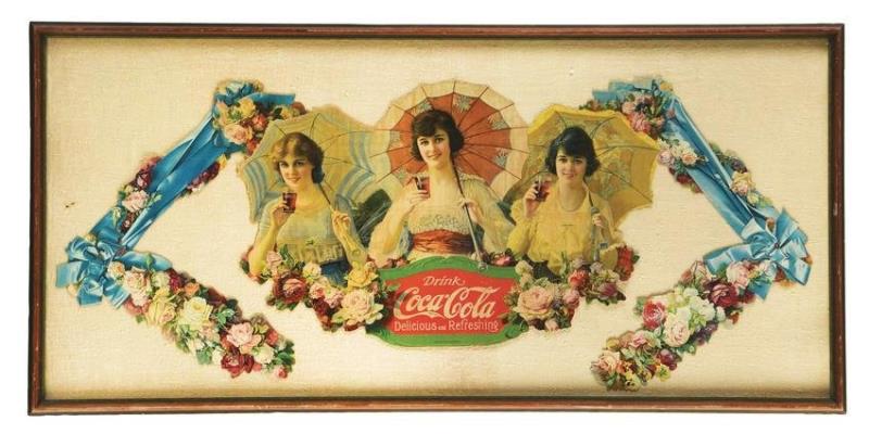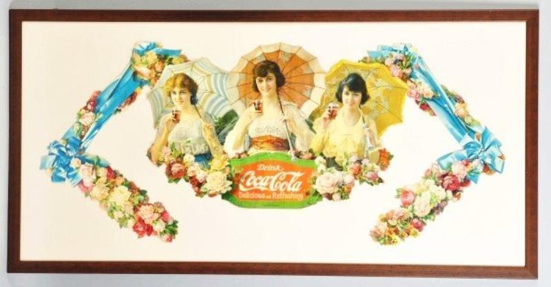 This is a beautiful framed Coca-Cola festoon featuring three young ladies and their parasol. It shows no areas of repair or cardboard loss, with one slight area of paper loss to the extreme bottom underneath the word "Refreshing". The red…