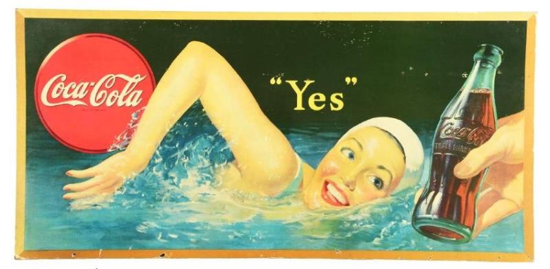 Sign marked "Forbes Boston", dated 1945. Great image of a woman swimming. Titled "Yes" and to the right is a hand holding a bottle of Coca-Cola. There is some edge wear, corner damage and added holes. Some soiling and rubs…