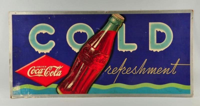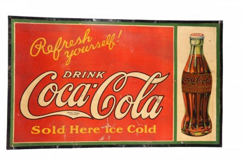 This cardboard sign has its original metal frame and was made by the MCA Sign Co. Massilion Ohio. The sign features a 1915 Coca-Cola bottle on the right section while on the left it reads "Refresh Your Self. Sold Here Ice Cold Coca-Cola". There are moderate rubs and scrapes as well as some surface loss and added punch holes. This is a very hard to find sign in any condition. (Good - Very Good). 60" x 36".