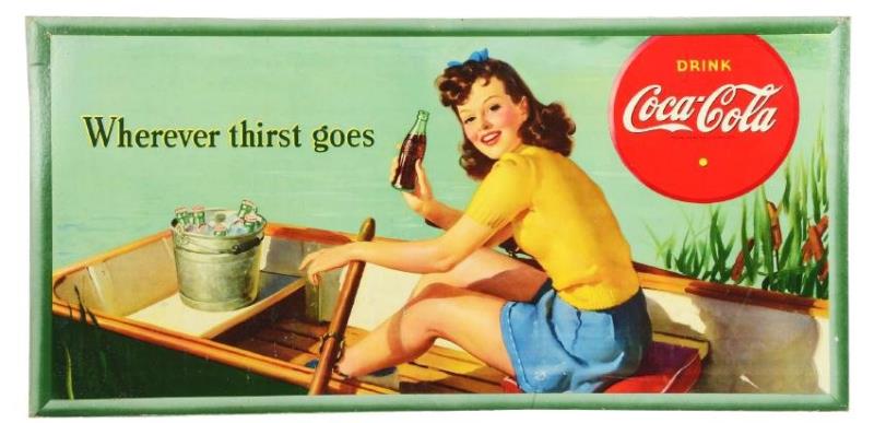 Sign marked "Edward & Deutsch Litho Co.", dated 1942. Titled "Wherever Thirst Goes". Shows a woman on a boat with an ice bucket full of Coca-Cola. There are some added holes, mild soiling and a few areas that show rubs.…
