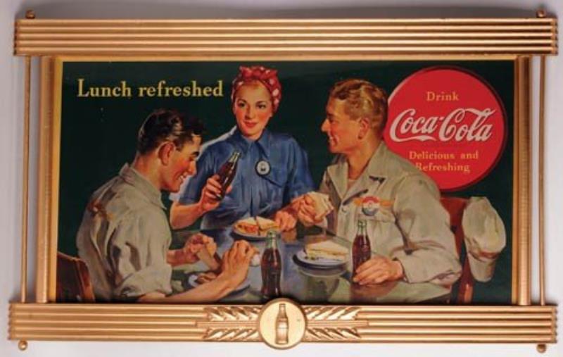 1943 cardboard insert sign in repainted gold wood frame 20"x 36". Hard to find image, bright and beautiful colors. Very nice