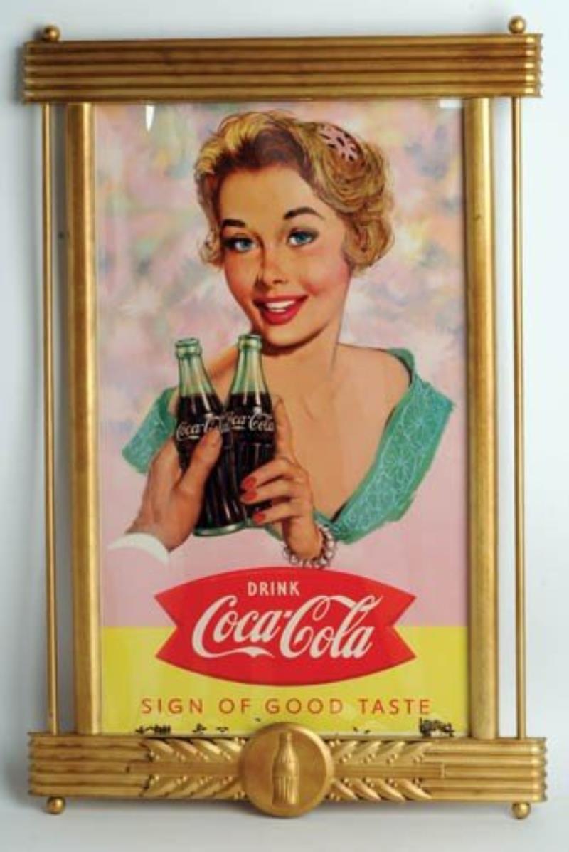 1954 Double Sided Coca-Cola Cardboard Advertising Sign in original frame. One side depicts female acrobat on trapeze reaching for a full Coke Bottle. Reads, Good Pause Drink Coca-Cola In Bottles. Lower left hand corner reads, Copyright 1954, The Coca-Cola Company…