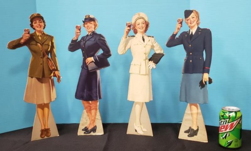 Set of four 17".5" Military service girl cardboard cutouts with easel stands. Including Womans Army Corps, U.S. Navy Waves Officer, Navy Nurse Corps, and Army Nurse Corps. All girls have bright colors with minor wear including light edge wear, water…