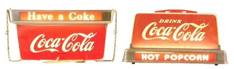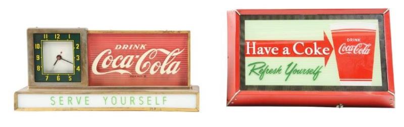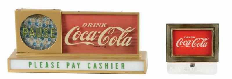 First is a counter top motion display light in restored condition. Lights and has motion. Second is a Coca-Cola cash register topper light-up. Original condition and working. Condition (Restored - Very Good). Dimensions Larger: 9" x 19 - 3/4" x 4 - 3/4".