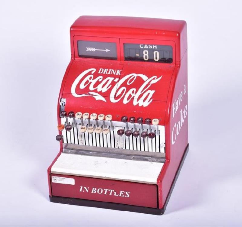 A mid-20th century Coca Cola branded cash register bearing a label for 'The National Cash Register Company Ltd, Marylebone Road, London NW1', model number 126(1) SP3, with functioning levers, bell and cash drawer, 44 cm high x 33 cm wide…