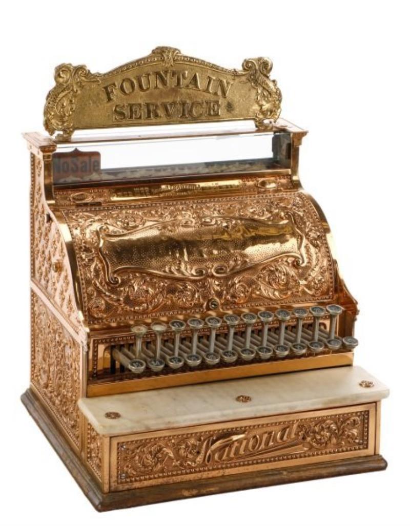 National Cash Register Company (American, founded 1884), circa 1902. A polished and lacquered bronze or red brass National Cash Register, model 8 having a Fleur-de-lis case, principal detail adders, a dolphin top sign stamped 'Drink Carbonated Coca-Cola in Bottles 5-¢'…