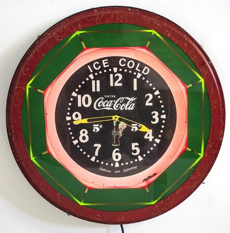 With circular chromed steel housing, and painted steel bevel. Reverse painted cover glass in octagonal pattern at edges of cover with lines of translucent blue and red. Dial with "Ice Cold/Drink/Coca-Cola/Delicous and Refreshing" with figure of Sprite boy peering out…