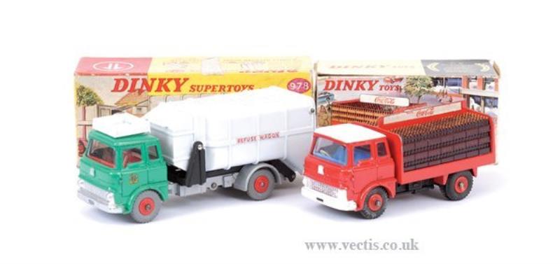 Dinky Bedford Lorry pair - (1) No.402 Bedford Coca Cola Truck - red cab, back, white roof, grille, bumper, red plastic crates, red plastic hubs - Good in Fair card picture box, missing one end flap, (2) No.978 Refuse Wagon,…