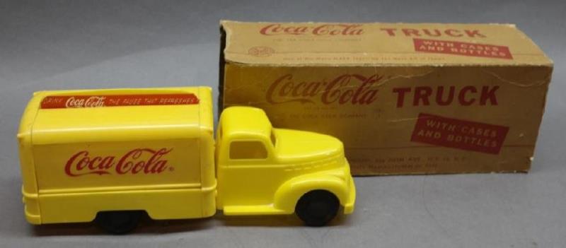 Original cardboard box (featuring "Drink Coca-Cola" logo) contains 10.5" long hard plastic free-wheeling delivery truck w/six original soda bottles/cases. Marx, produced for the Canadian market. 1950s Chevrolet truck. Box shows obvious and heavy wear w/end flap detached and incomplete and…