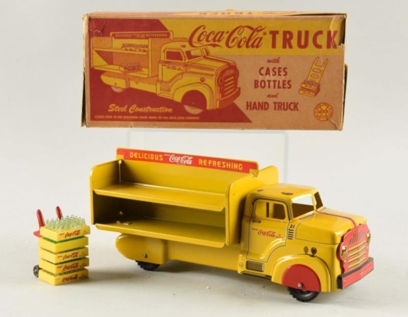 Coca-Cola Toy Delivery Truck w/Box, Marx pressed steel w/cases & hand truck, c.1950's, truck in Exc+ to Near-Mint cond w/complete box, 12.5"L.